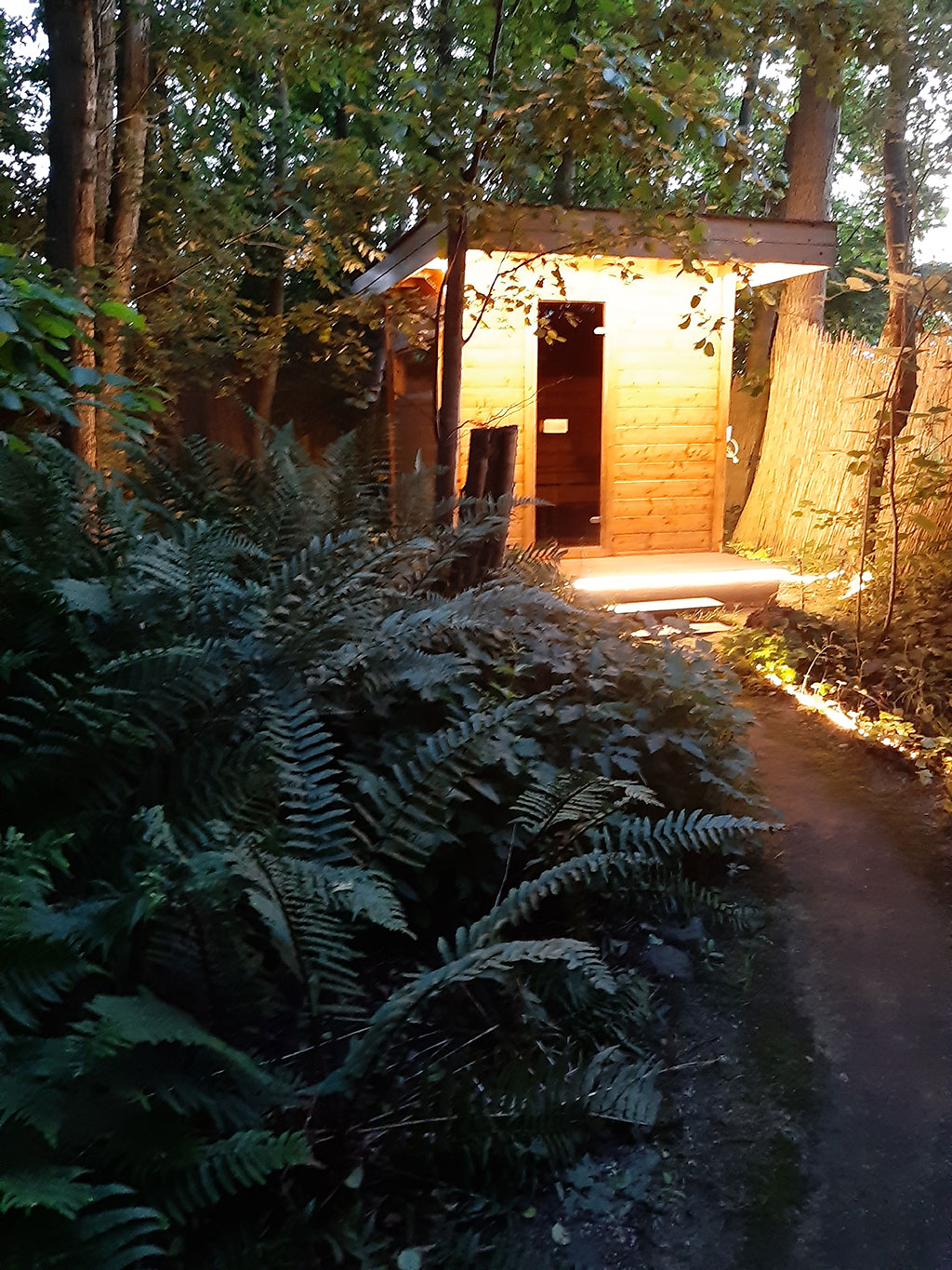 Een knetterend houtvuurtje verwarmt op een unieke wijze het water in het dieprode bosbad. Je lichaam geniet in weldadig warm water, terwijl je met je neus in de verse lucht zit. De geur van knisperend hout, zicht op de bomen en ontspannen in zuiver water. Want ons bosbad wordt voor elk gebruik volledig ververst, zodat er geen chloor aan te pas moet komen. Een ongeëvenaarde ervaring!